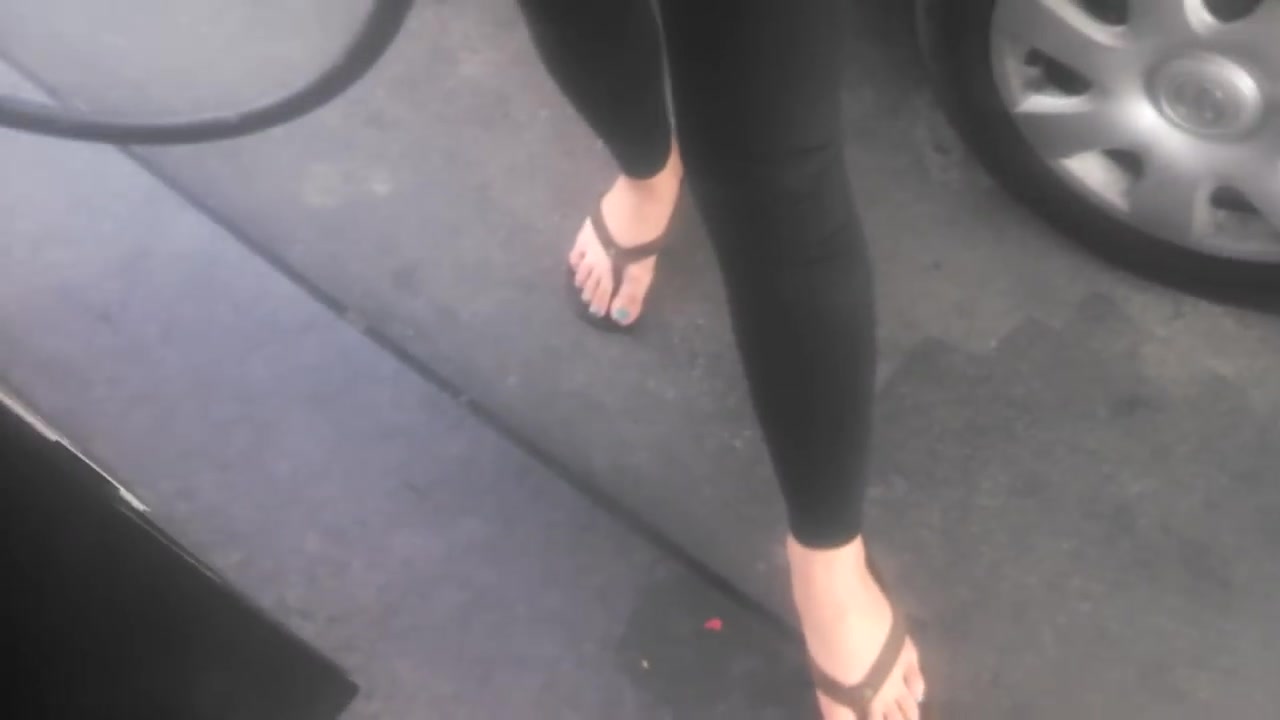 Asian cutie shows her feet at the gasstation